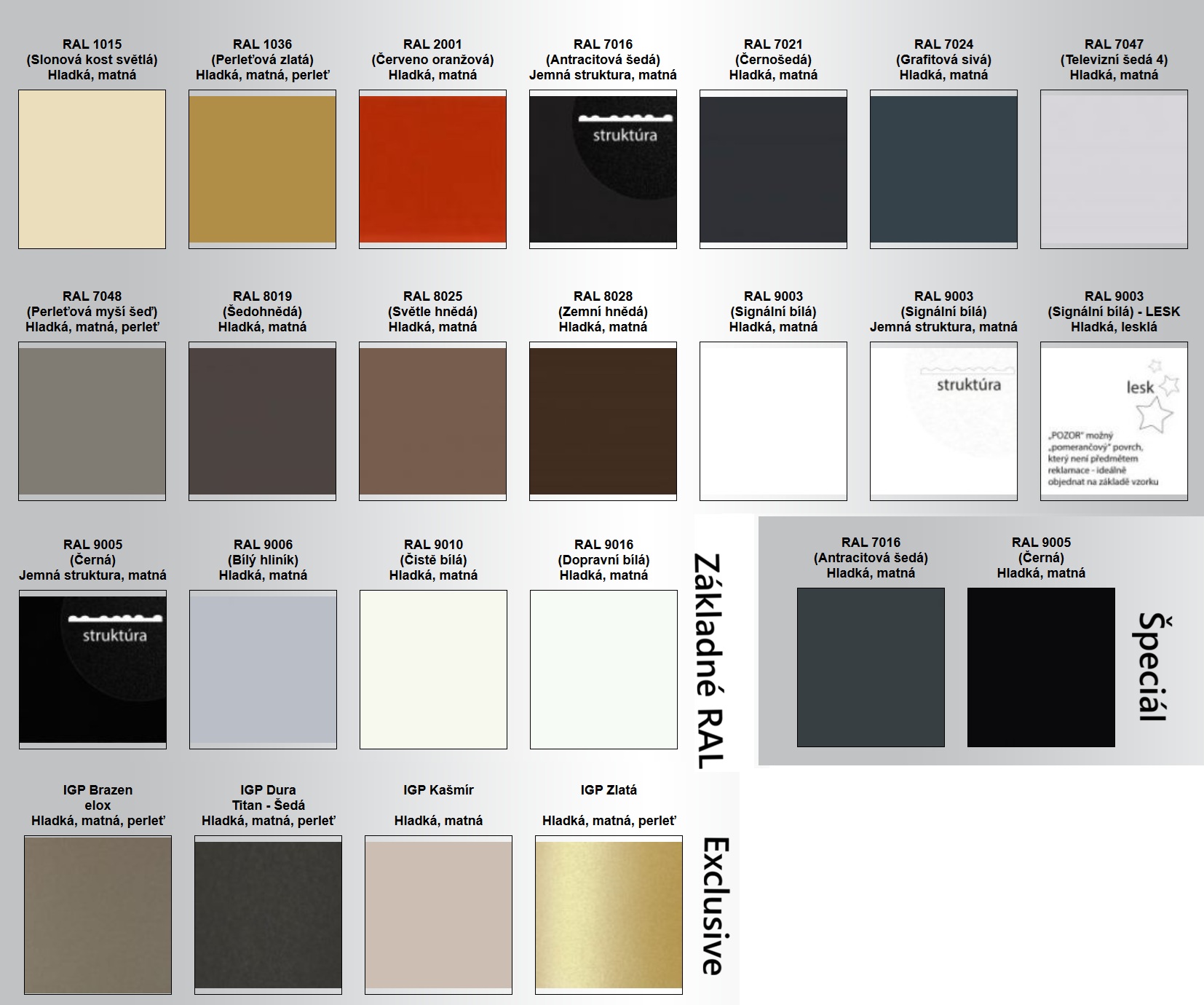 01-strieborný elox 02-svetlý nerez 03-tmavý nerez (lak.) 04-tm. nerez (nerez)